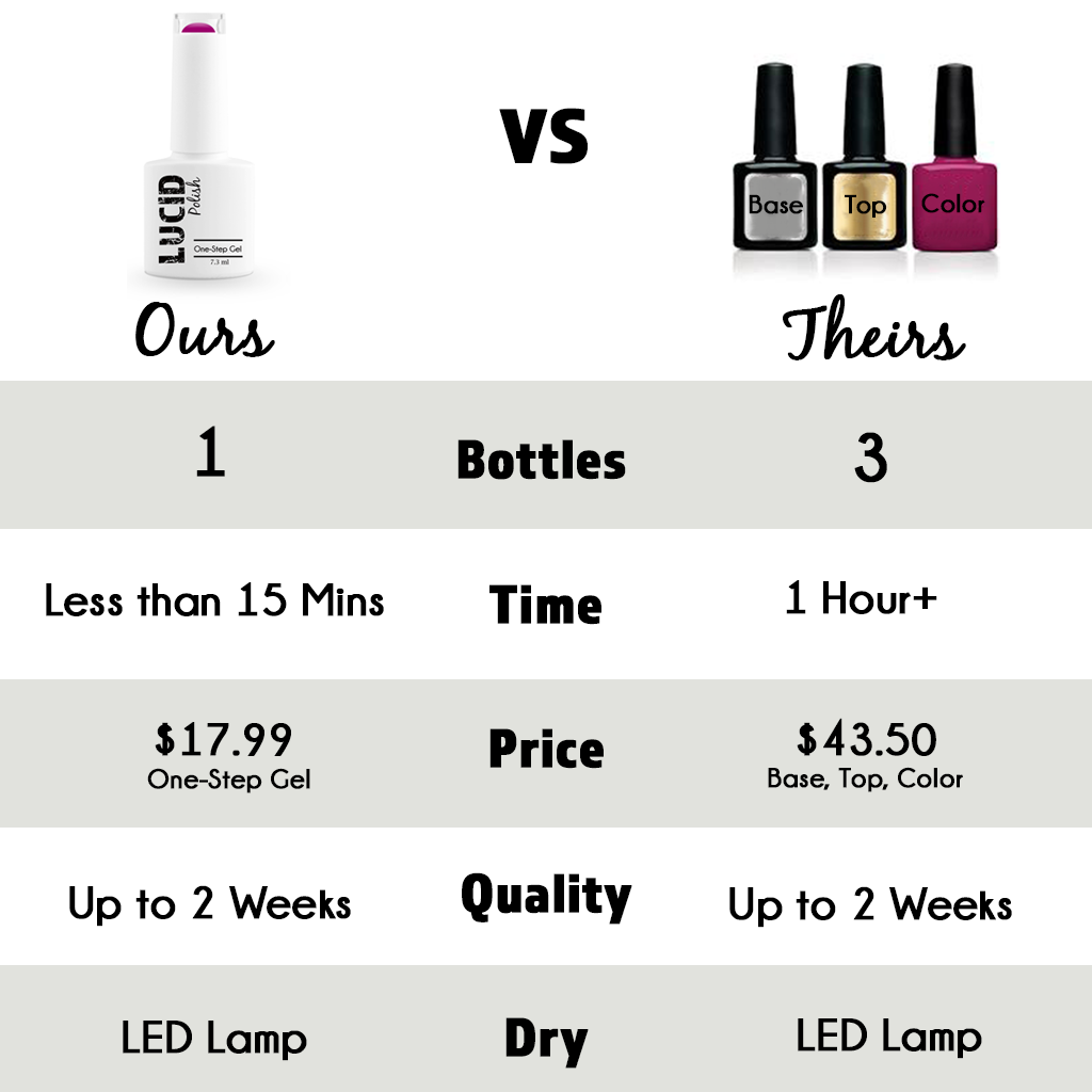 For a fraction of the price, you can have a professional grade gel mani or pedi that lasts up to two weeks, in 15 minutes or less!